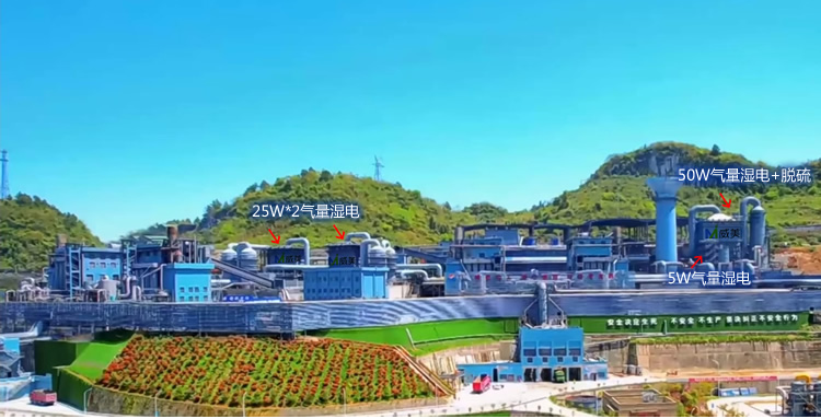 左側濕電除霧器已穩定運行兩年有余 右側為新調試的50W1260管黃磷尾氣末端煙氣深度脫硫濕電除霧設備