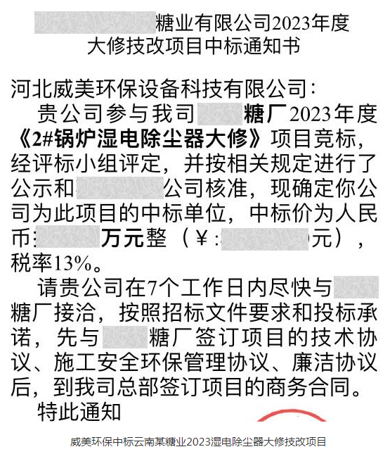 近日,威美環保中標云南某糖業2023年度濕電除霧器大修技改項目。