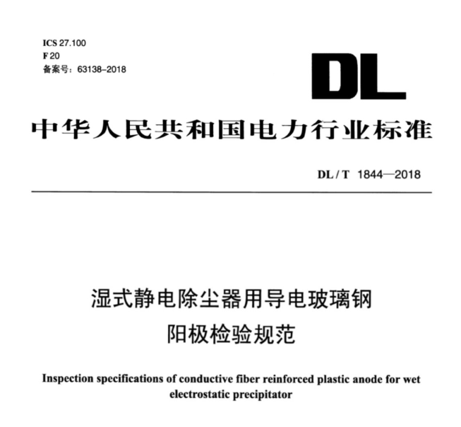 濕式靜電除霧器用導電玻璃鋼陽極檢驗規范 DL/T 1844-2018于2018年4月3日國家能源局發布,2018年7月1日實施。